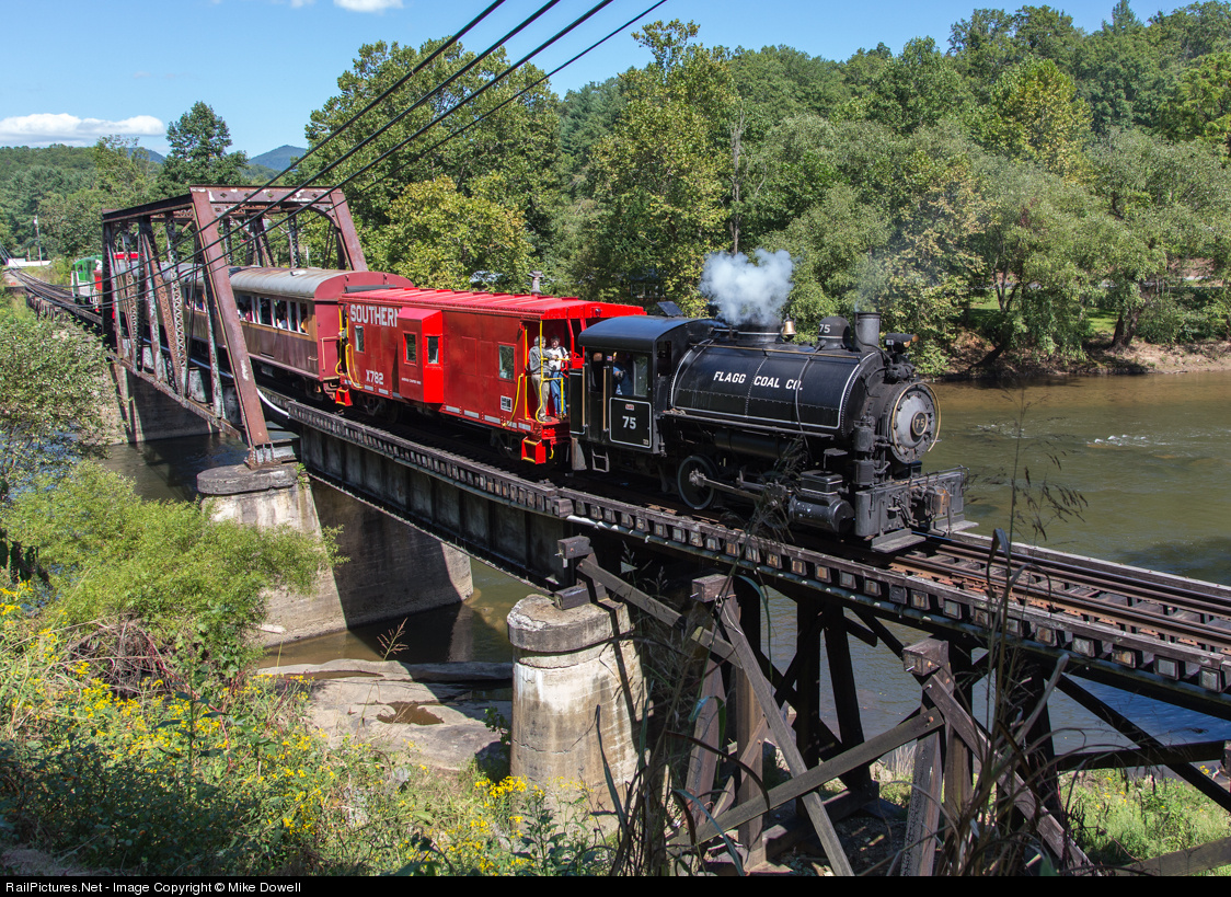 Great Smokey Mountain Railroad ex- Flag Coal Co. no. 75 crosses Deep Creek Bridge enroute to Bryson City NC.