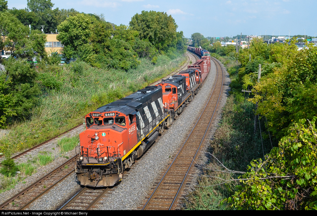 CN 527, a local transfer in the Montreal area, head towards Taschereau Yard. Power is three geeps: CN 9486, CN 7054 & CN 4116. This is always a long train and usually rates 3-5 geeps. For more train photos, check out http://www.railpictures.net/photos/mtlwestrailfan/