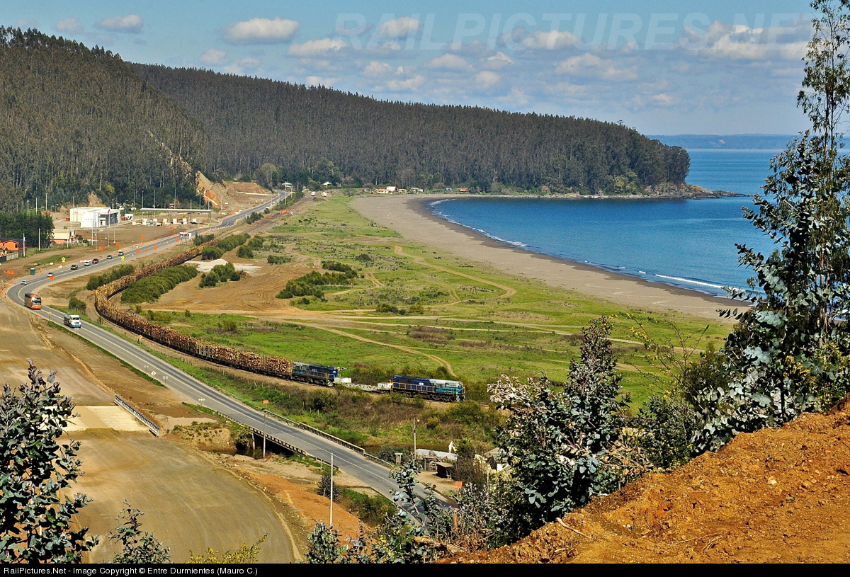 The train 50.094 Horcones - Nueva Aldea loaded with wood (Eucalyptus), after crossing the tunnel No. 11, surround the beautiful and rarely visited Chivilingo Beach, bordering the "Golfo de Arauco" and pacific ocean.
