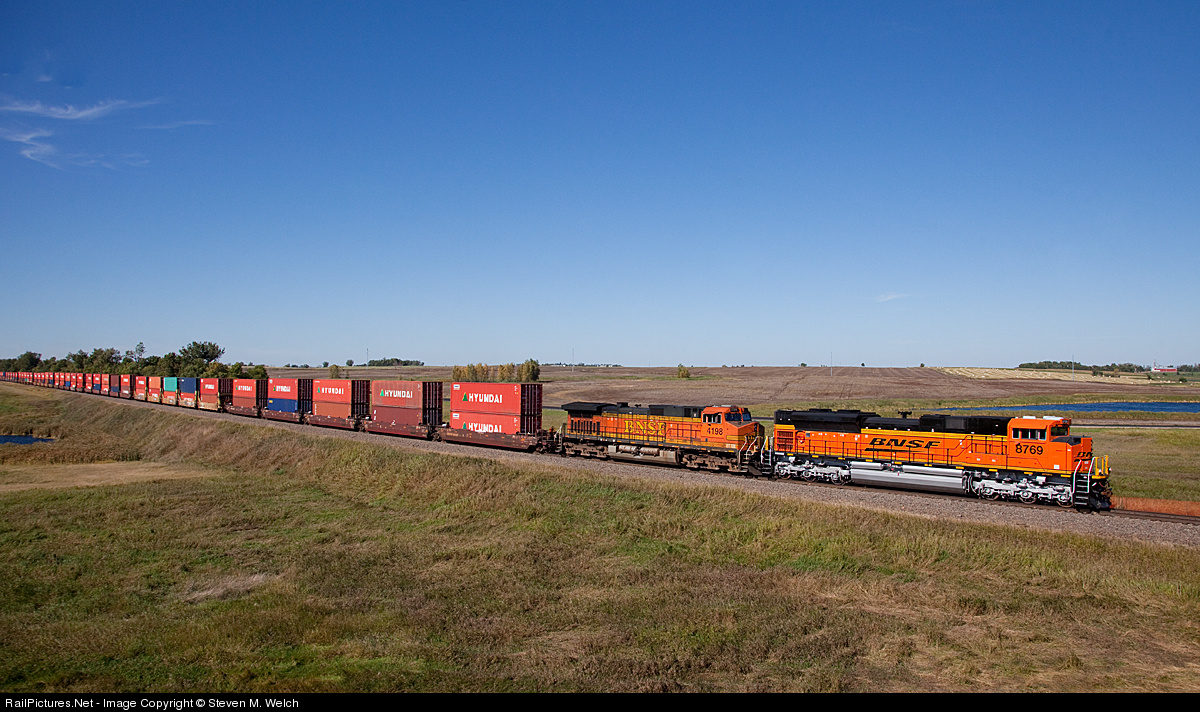 | Built on July 31st, 2013, BNSF 8769 looks like she's right off the showroom floor, leading an Eastbound stack train down the hill into Berthold.