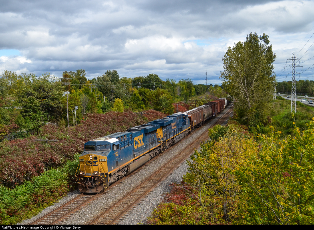 CN 327 is a train which runs with a CN crew from Montreal to Huntingdon, Qc, where a CSX crews takes over and takes it across the border. Here it has two of CSX's newer engines. They have slightly different paint schemes, the trailing unit (CSX 3077) having the newer boxcar paint scheme, the lead unit, CSX 722, has the older version of the dark future paint scheme. For more train photos, check out http://www.railpictures.net/photos/mtlwestrailfan/