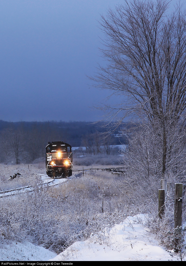 The morning is still young as CCGX 4009 runs light power from Orangeville amid a frozen winter landscape and ice fog.