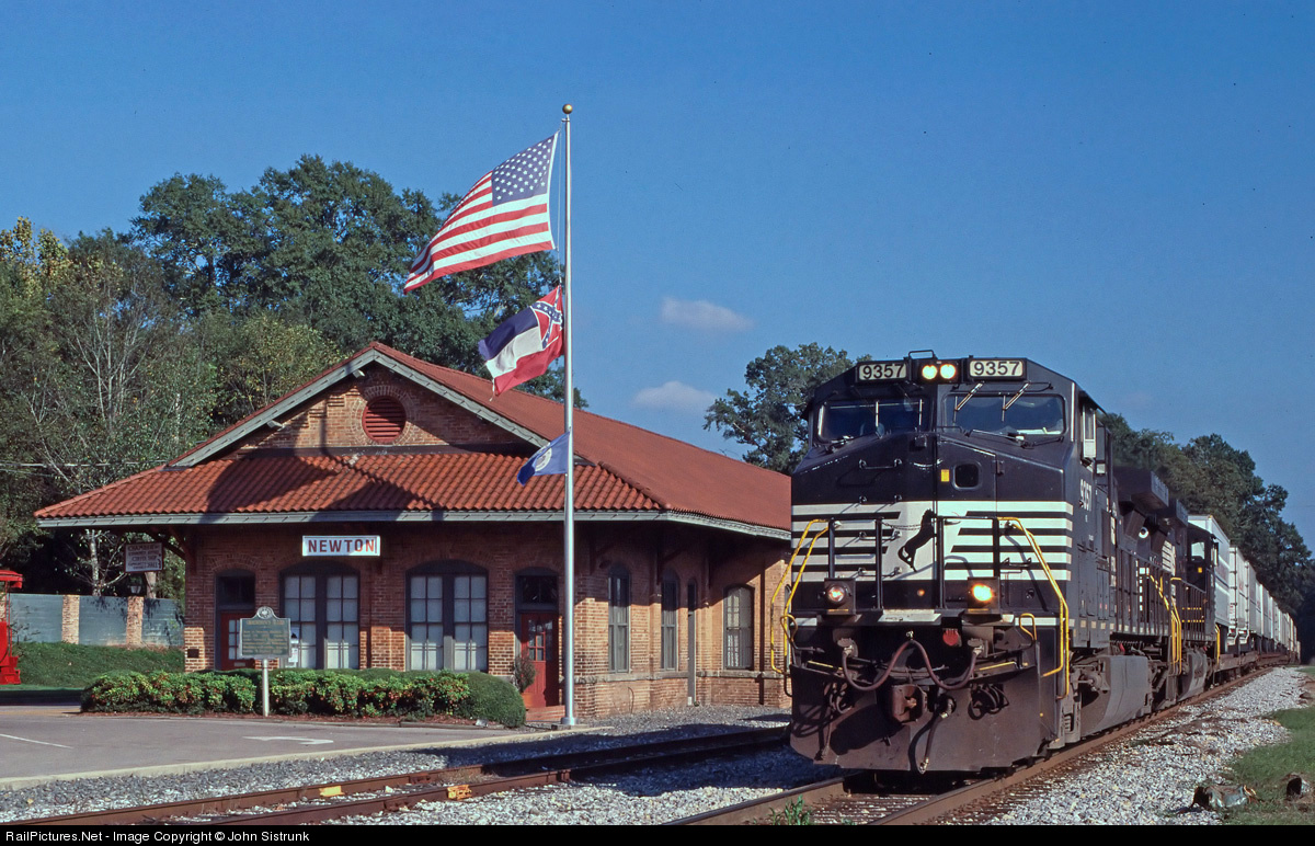 | NS 9357 slides by the classic brick depot at Newton, MS. This town was the location of the Civil War Battle of Newton's Station on April 24, 1863. Union cavalry under Col. Benjamin Grierson attacked deep behind enemy lines and destroyed miles of Confederate trackage. Grierson's raid was the inspiration for the John Wayne movie "The Horse Soldiers." |