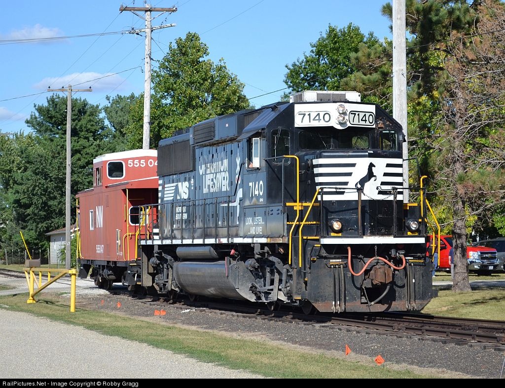 NS GP60 7140 handles the caboose hop to the shops at the Monticello Railway Museum.