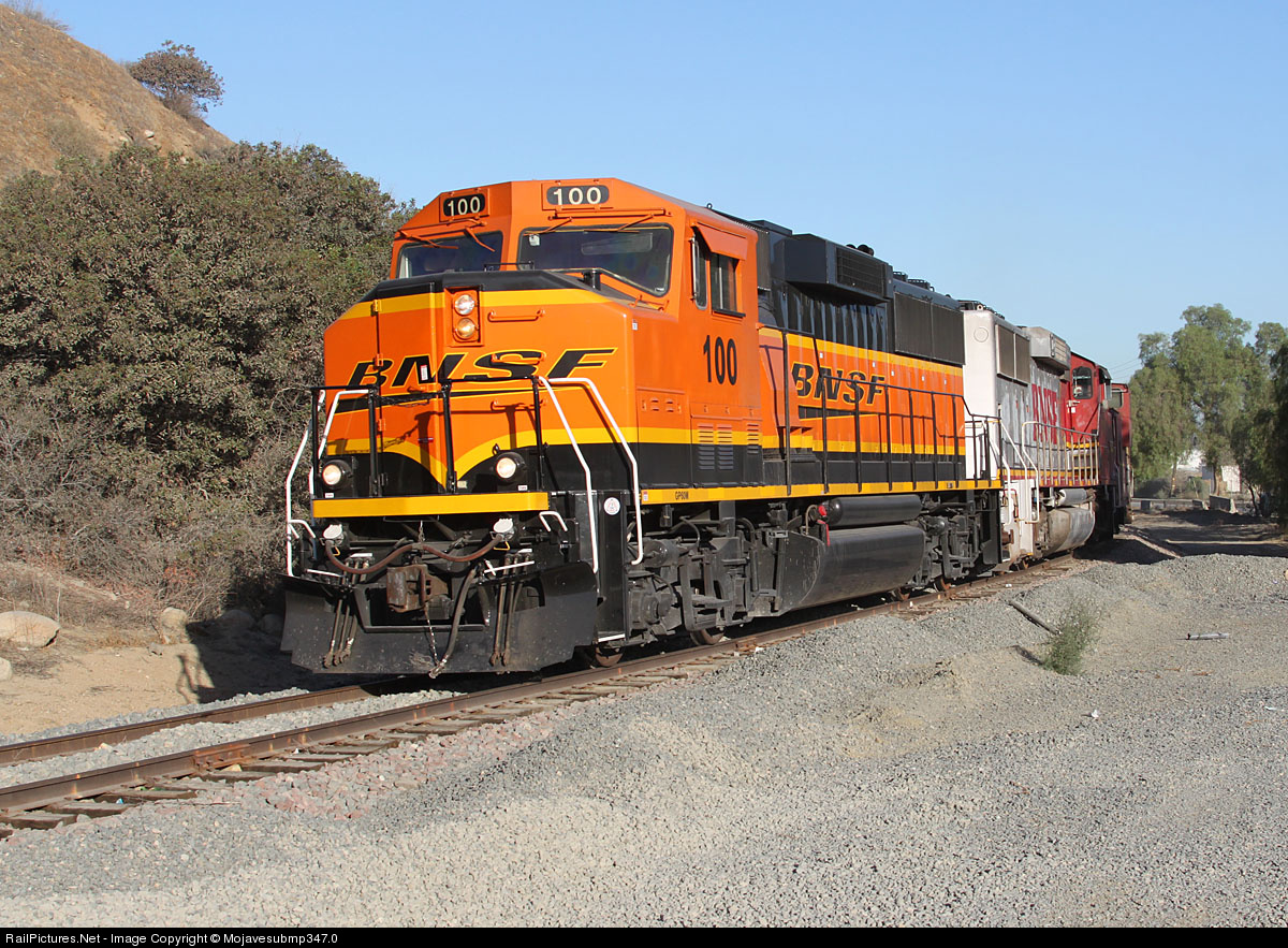 | Nearing the entrance to the 3M facility, BNSF 100 leads the Corona Local down what's left of the old Santa Fe Elsinore Line. |