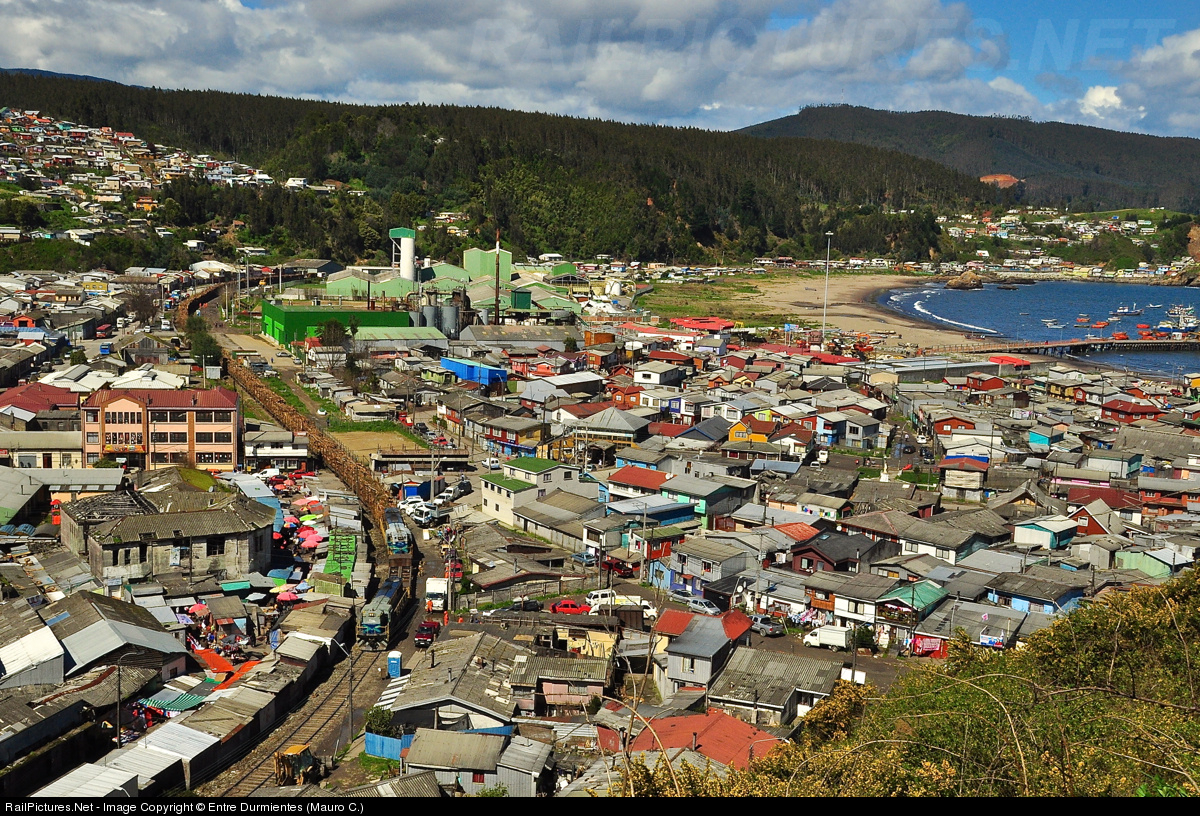 The train 50.094 Horcones - Nueva Aldea loaded with wood (Eucalyptus), after crossing the tunnel No. 4, crossing Lota city, passing among the houses and trading posts, bordering the "Golfo de Arauco".