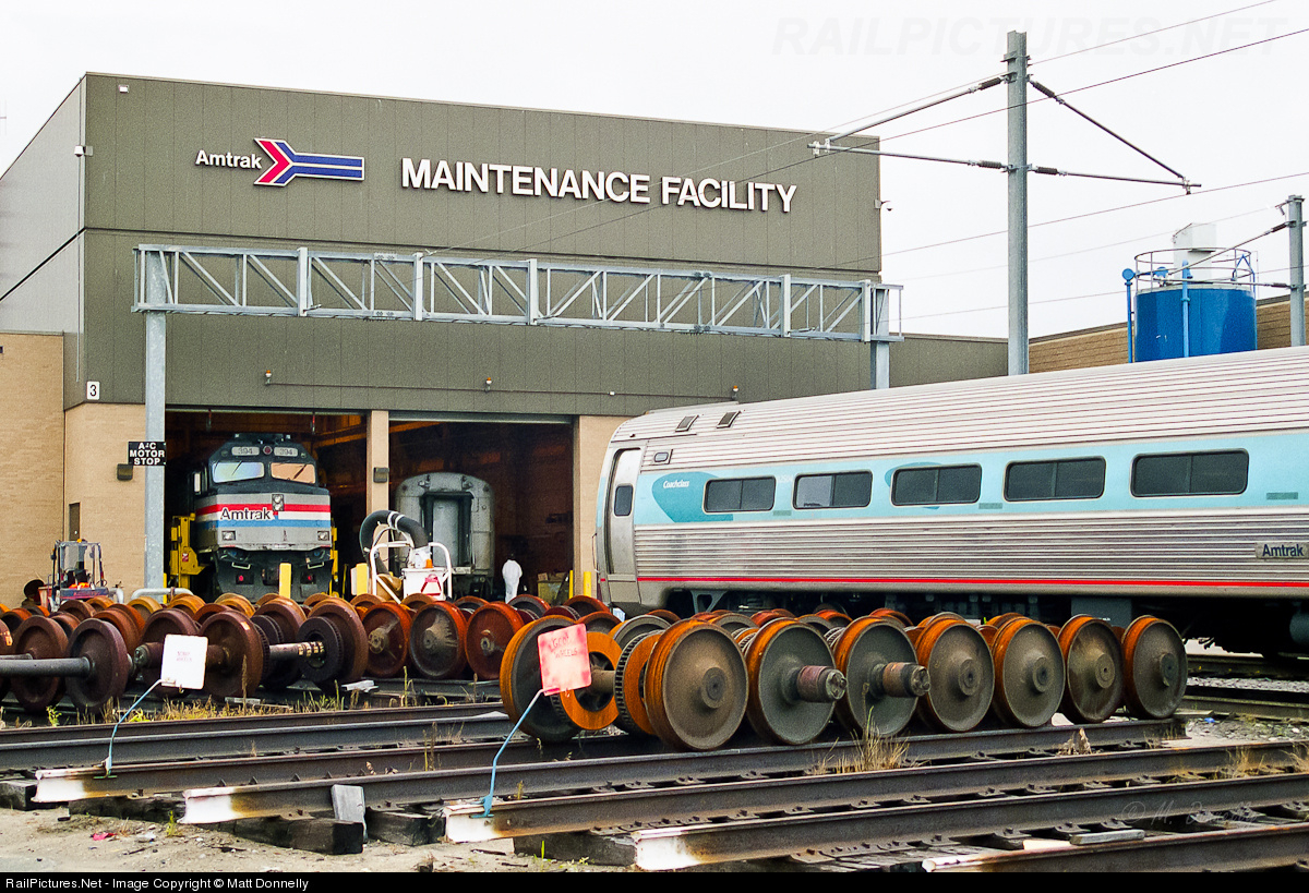 | F40 394 is in the shop with a Phase V (also known as the lava lamp scheme) Amfleet I Coach sitting outside amid a selection of various wheel sets. This was the scheme of "Acela Regional" back in the days when everything was going acela. Even the HHPs had Acela logos on them. Photo taken on RR property with permission. |