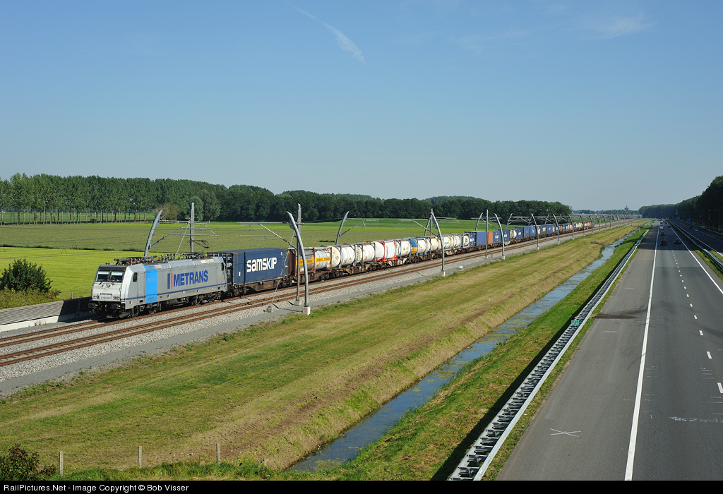 | Metrans 186 289-5 with a containertrain from Praha Uhrineves to Rotterdam Waalhaven near Vuren at the Betuweroute. All locomotives of Metrans are equipped with GPS and their actual position can be seen at http://poloha.vozu.cz/ |