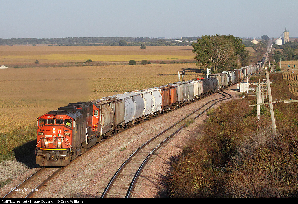 The daily Kirk Yard, IN, to Waterloo, IA, manifest train is westbound as it passes thru Beth Siding with 7300 feet of train and the CN 5548 and CN 5415 for power. The train is 34 miles from the destination of Waterloo Yard. Beth Siding is located between Winthrop and Masonville on CN Dubuque Sub at MP 240.9.