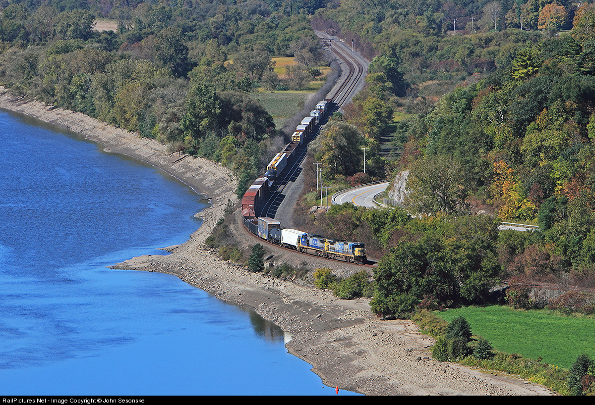 CSX Willard, OH to Selkirk, NY freight Q384-27 rolls around Big Nose Curve in the heart of New York's Mohawk Valley with a relatively short train. The river, which is also the NYS Erie Canal, is at low winter levels due to a lock issue just down river from here.