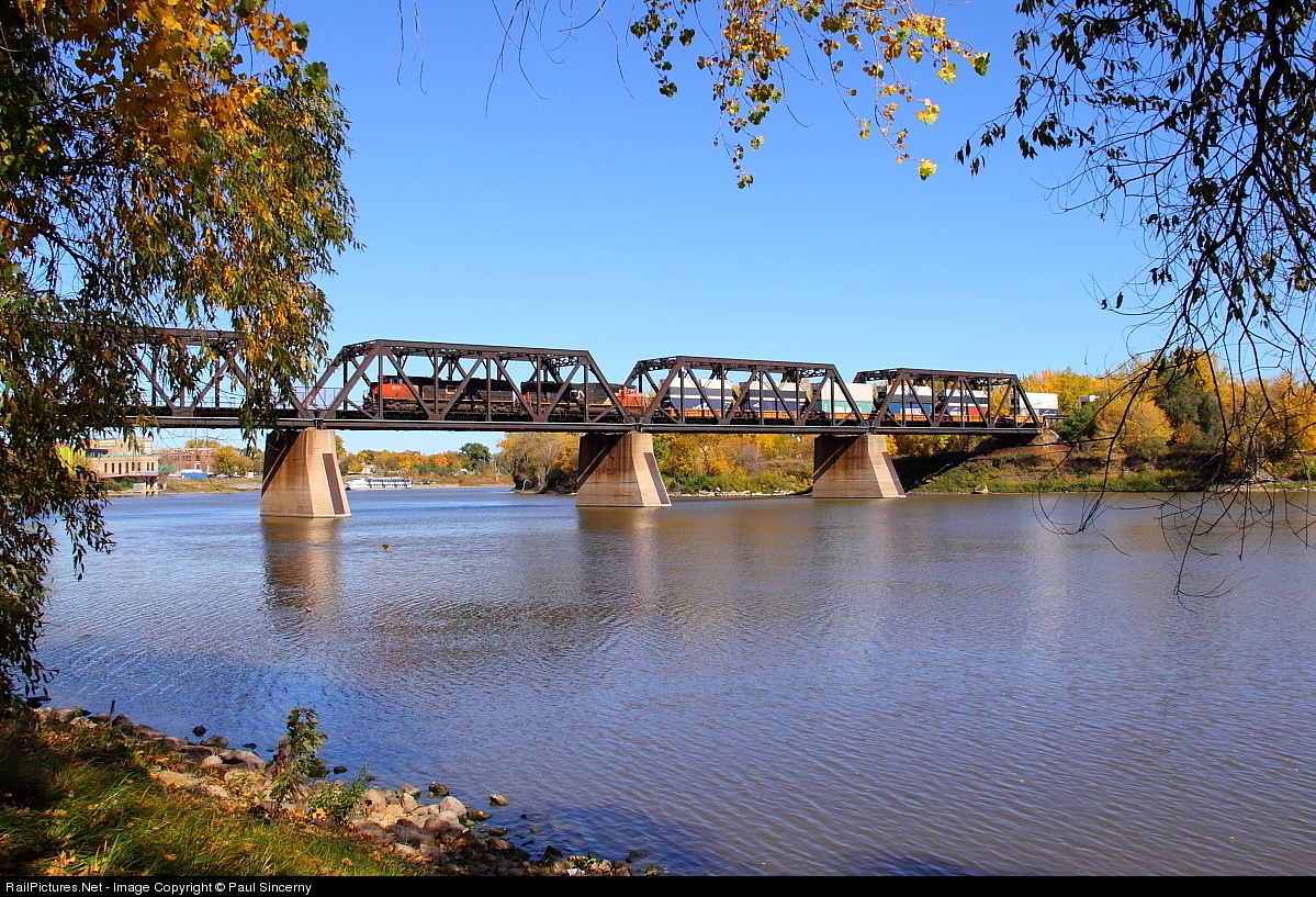 Q111 heads west across the Red River into Winnipeg's downtown area.