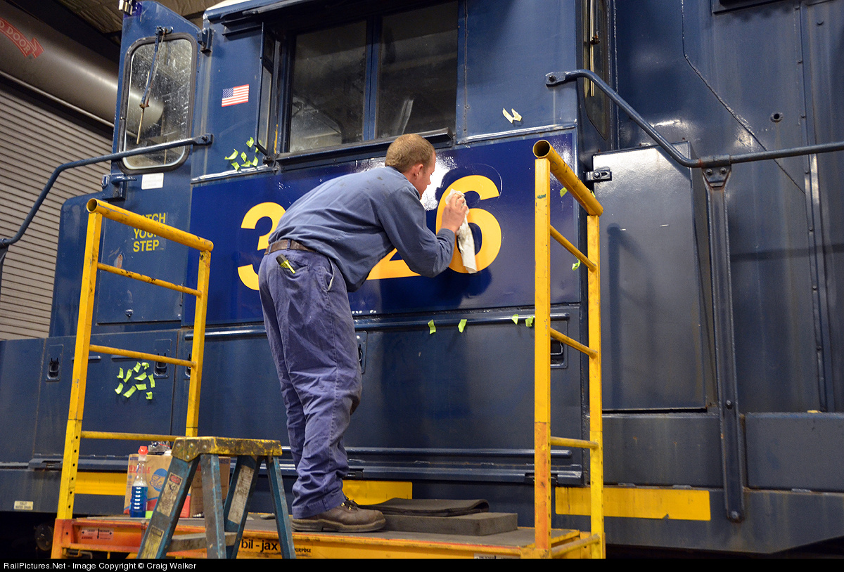 A shop worker for North Shore Railroad Company’s assortment of railroads renumbers HLCX 6303, which is becoming Lycoming Valley Railroad 3026. Built by EMD in February 1968 as Missouri Pacific SD40 729 (and later MP 3029, then PLM 3029, later rebuilt as an "SD40-2" by Morrison-Knudsen [as MKCX 9056], who then sold it to Helm Leasing), this new addition to the LVRR roster will soon be serving customers in central Pennsylvania. Photographed on railroad property with permission and full PPE.