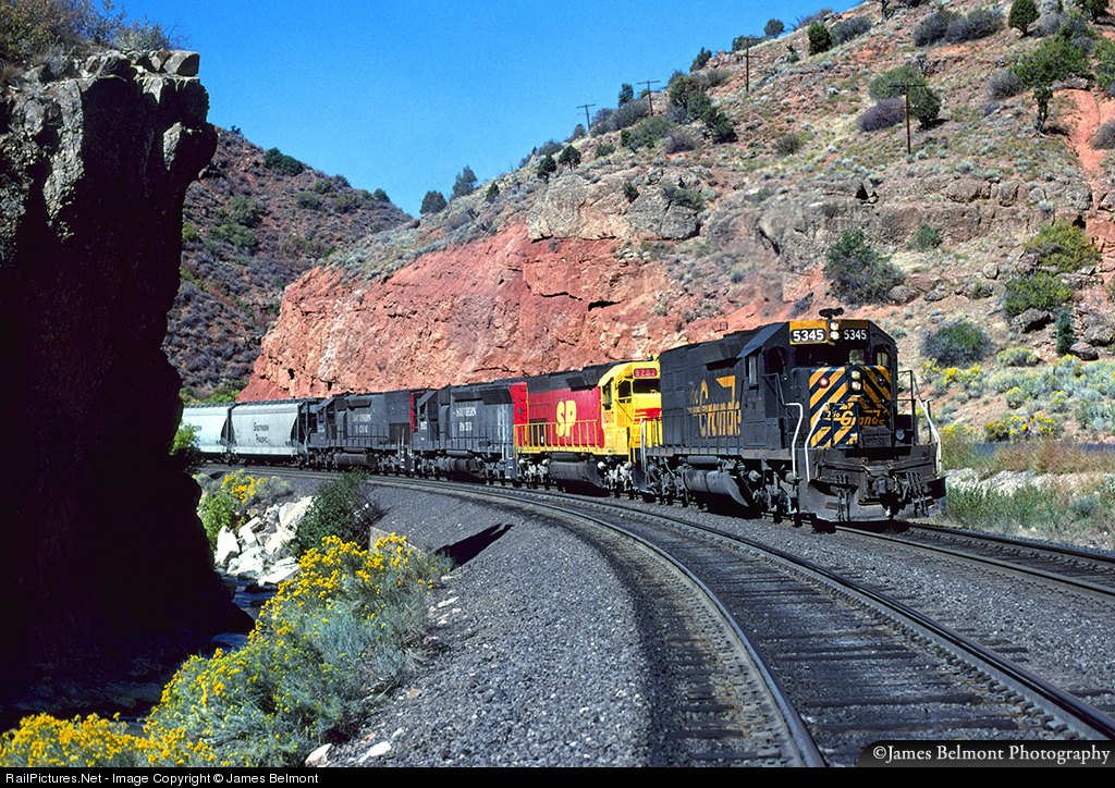 Rio Grande merchandise train 136 climbs through scenic Spanish Fork Canyon with Southern Pacific pool power. This area of the Red Narrows between milepost 673 and 674 features two eight degree curves resulting in a grade compensated for curvature at 2.67%.