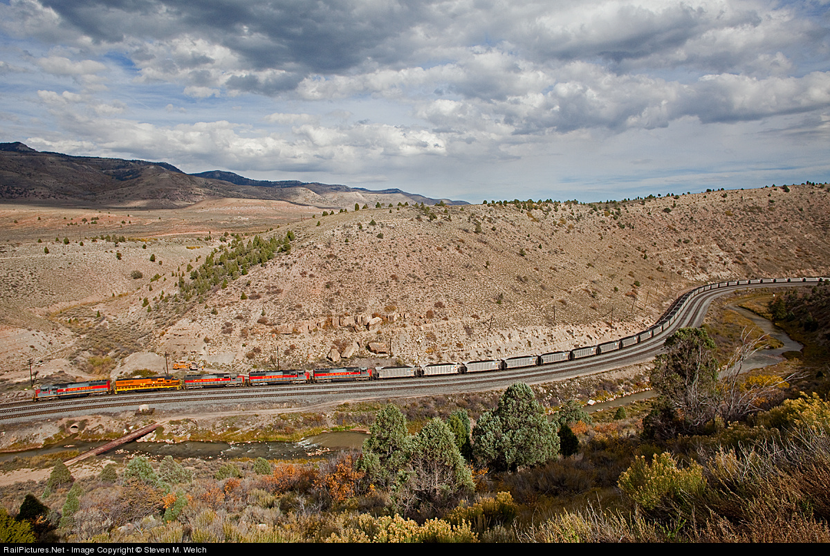 | Five of Utah Railway's unique units help lift a Wildcat coal load through the Price River Canyon, with seven more units cut in mid train. The Utah Railway climbing Soldier Summit is one of the best sound shows I've ever heard! |