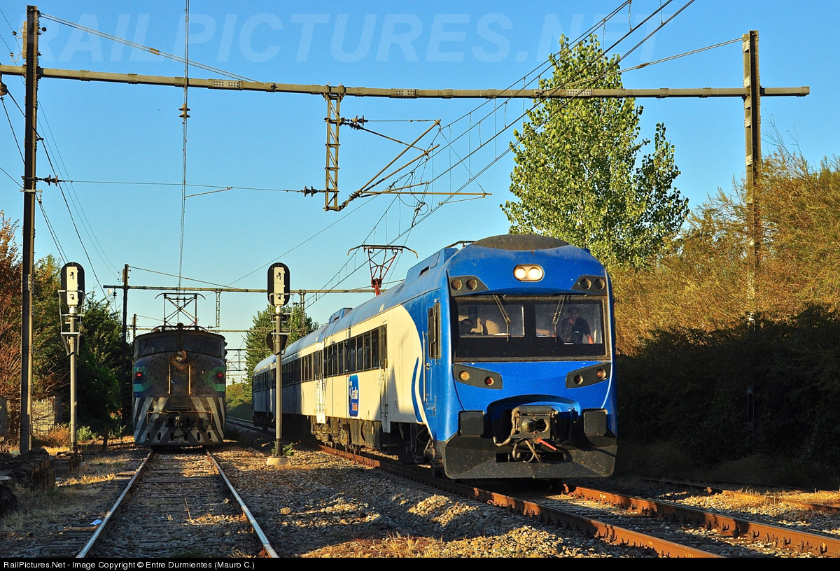 Passenger service TERRASUR with automotive UTS of spanish origin, make crossover with freight train X-5 of FEPASA, Breda Marelli E-3227 electric locomotive of Italian origin, in the passing loop and former station of Miraflores, Linares city.