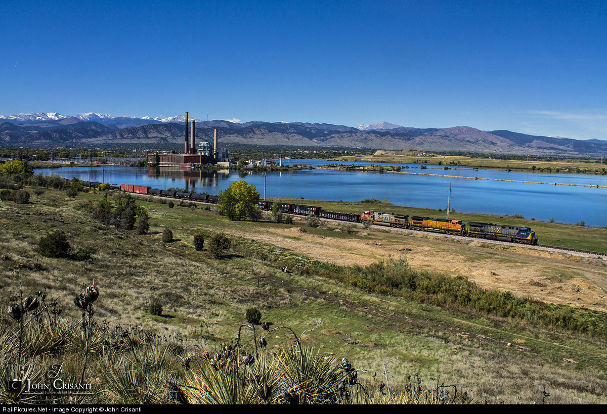 | The Laurel, MT to Denver, CO Manifest led by a CSX AC6000CW leaves the city of Boulder, CO with the Valmont Power Plant in the background.