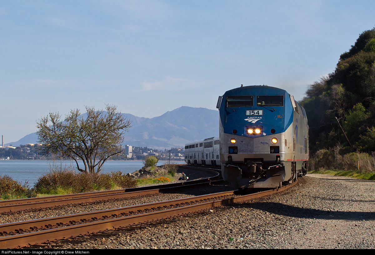 | Amtrak #5 skirts along the Carquinez Strait at Port Costa as it heads west running early towards its destination of Emeryville, CA on 3/10/13. |
