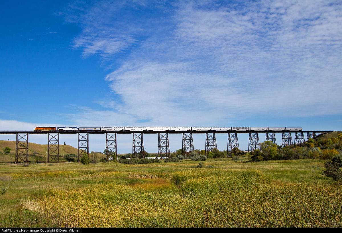 BNSF 7317 gives Amtrak train #7 a hand as it heads west over the Gassman Trestle west of Minot, ND on 9/25/13.