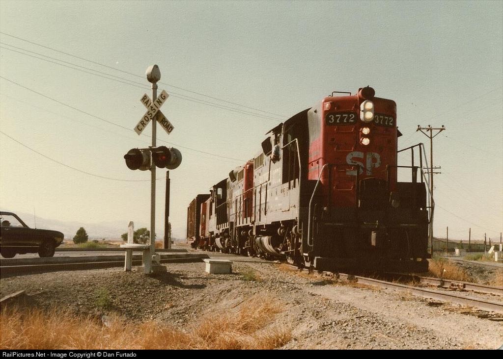 | SP 3772 coming back from the Kodak plant in Dublin on what was left of the old San Ramon Branch during the early 80's. The remainder of this branch was removed when Kodak shut down soon after this was taken. |