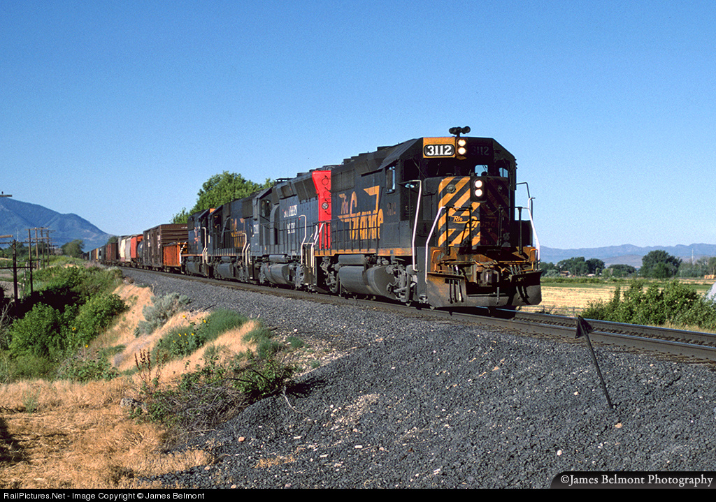 Here's the one and only time I've witnessed a Southern Pacific GP40X, not realizing it until the slide was scanned 25 years hence! Apparently the SP had a roster of four of them, built by EMD in 1978. Rio Grande's 177 train from Pueblo is pictured approaching Springville on the morning of Aug. 13, 1988.