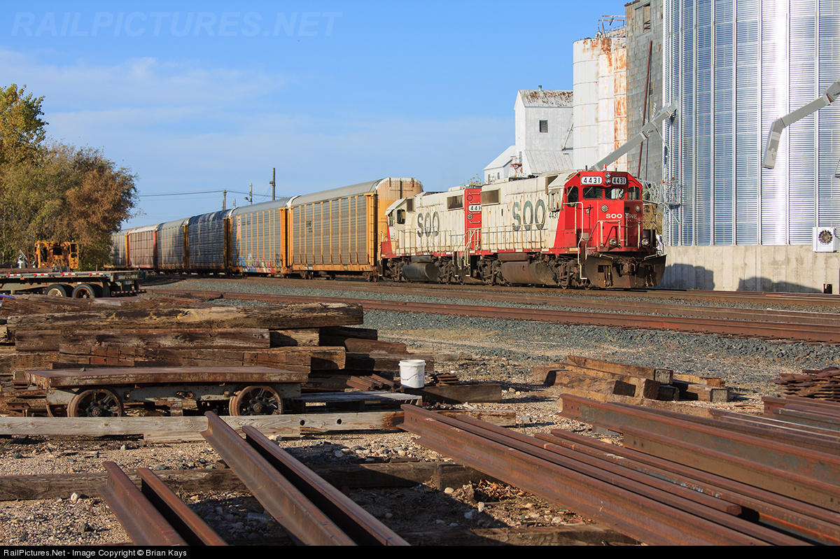 | A pair of SOO Line locomotives switch auto racks off of a westbound (north) train in the Thief River Falls yard. These locomotives replace the pair of GP20C-ECO's that patrolled the area for months. Both power sets are great, but the pair of red and white SOO power is preferred. |