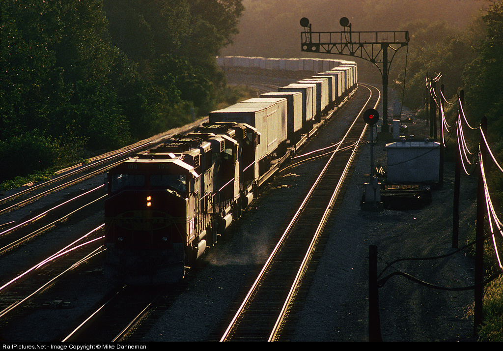Argentine bound A member of Santa Fe’s westbound intermodal fleet cruises toward Argentine Yard in Kansas City, Kansas, on September 14, 1990. Three Santa Fe GP60Ms pull the train, including the first one, No. 100, on the point. The train is about to pass under 12th Street Viaduct in this early morning view.