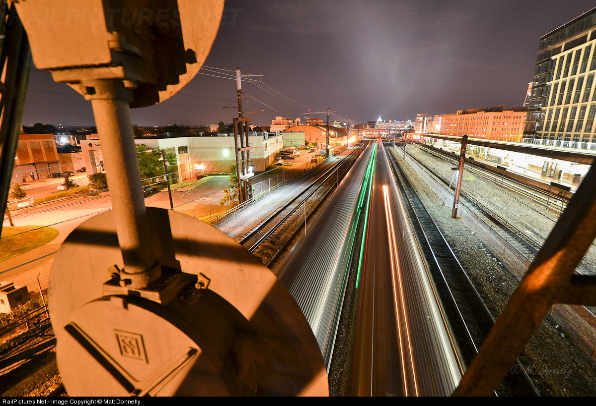 The 533 emits a plume of exhaust into the night sky while throttling up to bring a string of Amfleets out to the yard as an inbound Northeast Regional passes on the adjacent track. Note the Union Switch and Signal logo on the back of the old B&O signals. Photo taken on rr property with permission and protection while complying with applicable rules.