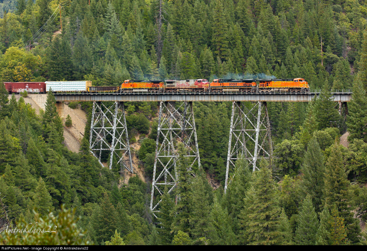 | BNSF 7726 smokes just slightly as it crosses the Clear Creek Trestle in Keddie, California on a cloudy fall day. The screeching from the cars echoes throughout the mountains as its done for many years. Soon the train will arrive at the World Famous Keddie Wye where it will receive a fresh crew and head down the Feather River Canyon. |