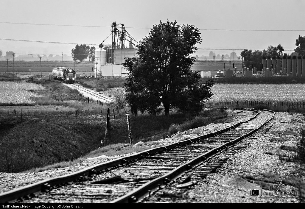 A Great Western Railway local led by two GP38-2s passes the grain elevator at Liberty, CO between Mead and Longmont with a cut of grain cars.