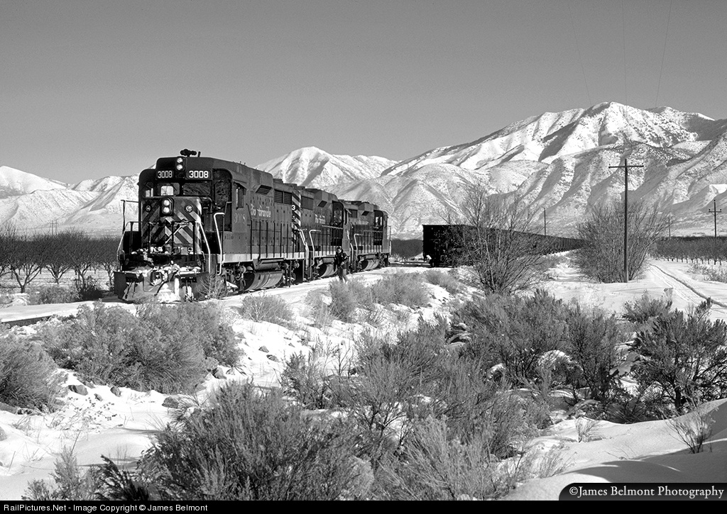 On a spectacular January morning in '89, Rio Grande's 662 local cuts off from a train of dolomite empties on the Tintic Branch at Santaquin siding. The trio of GP30s will run around the cars and shove them into Geneva Steel's Keigley yard for loading. Dormant fruit orchards line both sides of the track while 10,687 ft Mt. Loafer looms in the distance.