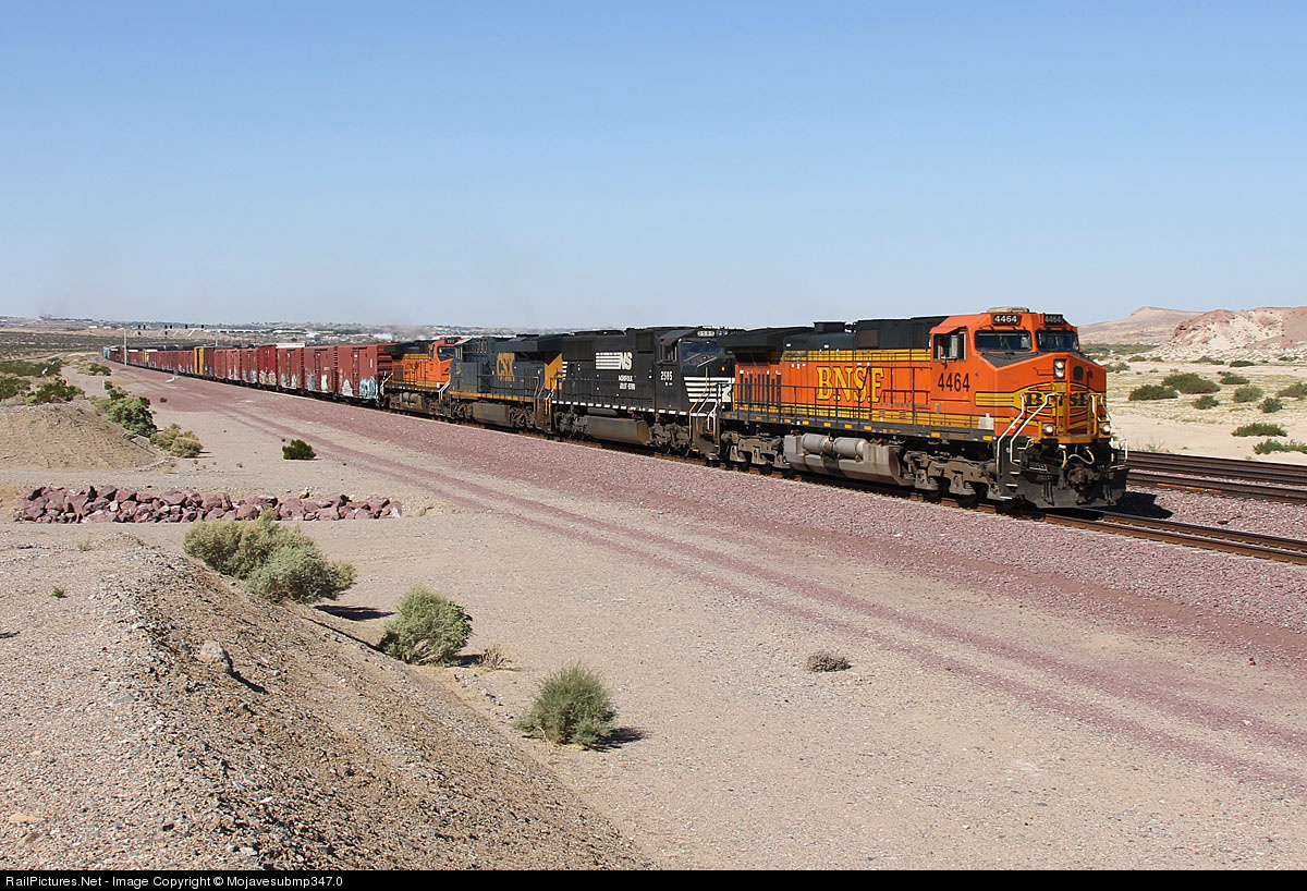 BNSF 4464 leads this eastbound general freight with a little pool power from NS and CSX through Daggett on the Needles Sub.