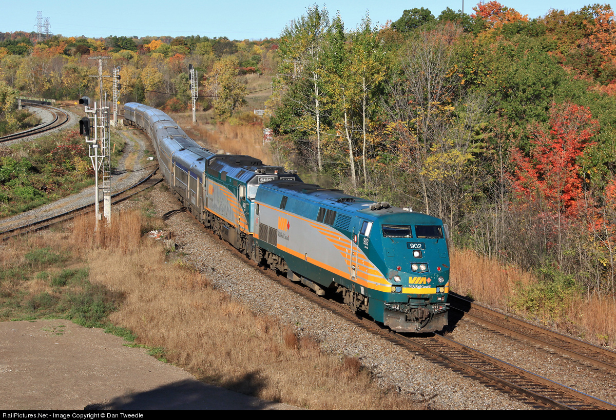 | A sure sign of the Canadian Thanksgiving long weekend, a double headed VIA 70 with 902 and 6439 on the point of eight stainless steel Budd cars winds its way through Hamilton West. |
