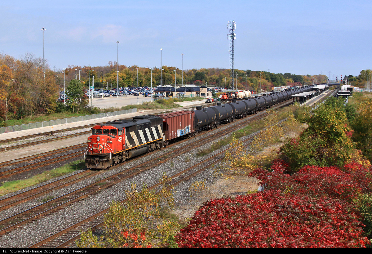 A solo CN SD60F brings a unit train of empty crude oil tanks through Aldershot on a gorgeous fall afternoon.