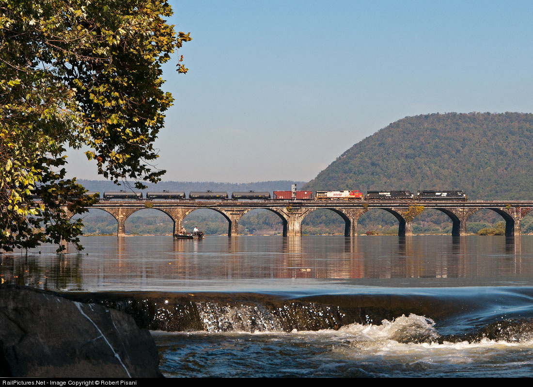 | An loaded NS crude oil train crosses Rockville Bridge with a relatively clean BNSF warbonnet Dash 9-44CW in the consist. Power for the train was NS 1092, NS 9767 and BNSF 706. This train is headed to Westville, NJ for unloading. |
