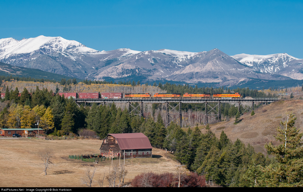 Yet another shot from "Too Many Photos" bridge in East Glacier Montana on the BNSF's Marias Pass Line. Two Medicine Bridge is definitely overshot, but the great weather, fall colors, and the matched power with shiny clean BNSF 7497 make for a nice image.
