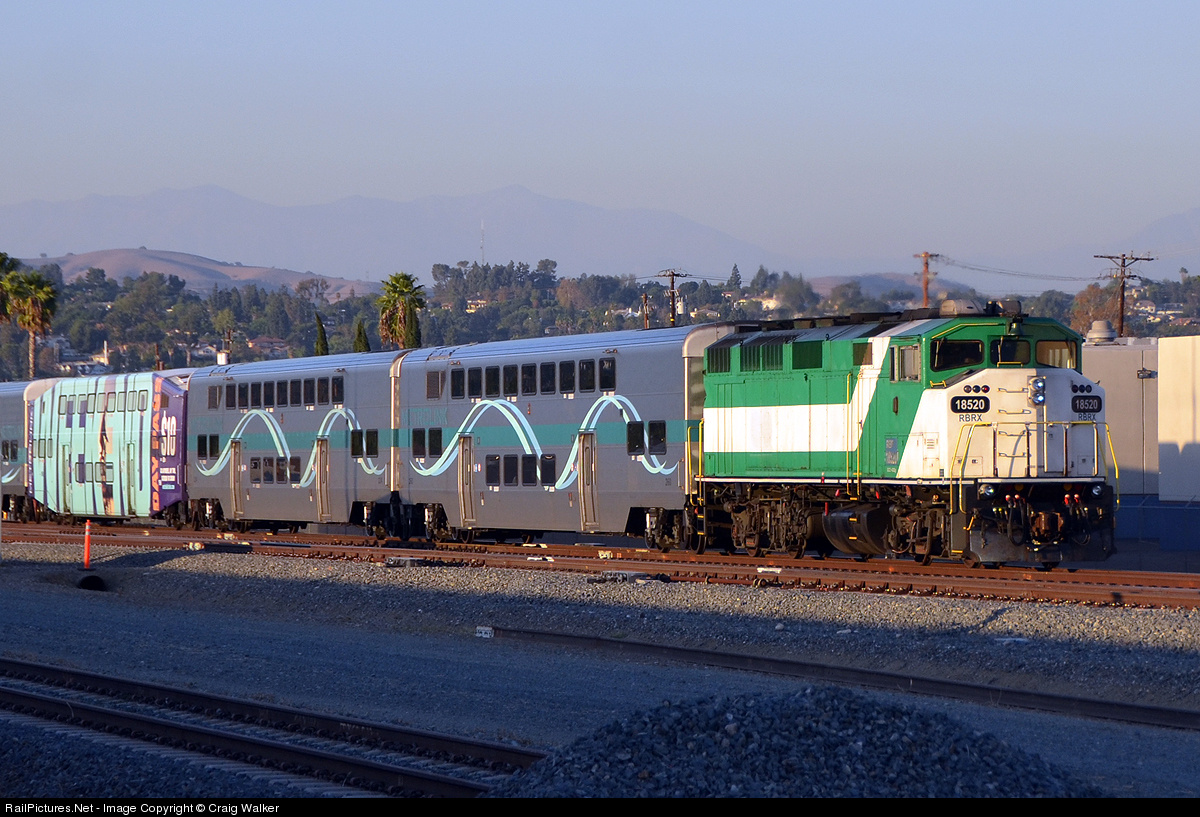 While southern California's Metrolink cycles their locomotives out for installation of Positive Train Control (PTC) equipment, the agency has leased three former GO Transit F59PH diesels. Shoving on the rear of Metrolink train 689 (Irvine to Los Angeles) is Rosen Beaudin Group 18520 (ex-GOT 520), still in GO colors. Combined with coach 198, wrapped to promote Metrolink's weekend service, this has become a very colorful train! (Fullerton, California; September 17th, 2013)