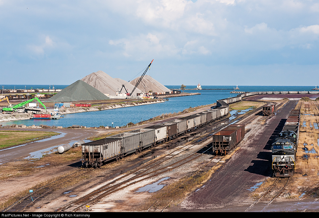Mountains of aggregate material, construction and dredging equipment, hundreds of hoppers both loaded and empty, and some NS motive power all combine to set the stage for another busy day at the Ashtabula Harbor Yard