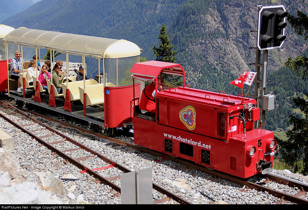 | What a big signal for such a little train! This imposing touristic train is a part from the route from Le Chatelard - Les Montuires - (little panoramic train) Lac d'Emosson. The gauge is 600mm. Here this train leaves the station Les Montuires (1821 meters over sealevel). And behind of the train is the abyss |