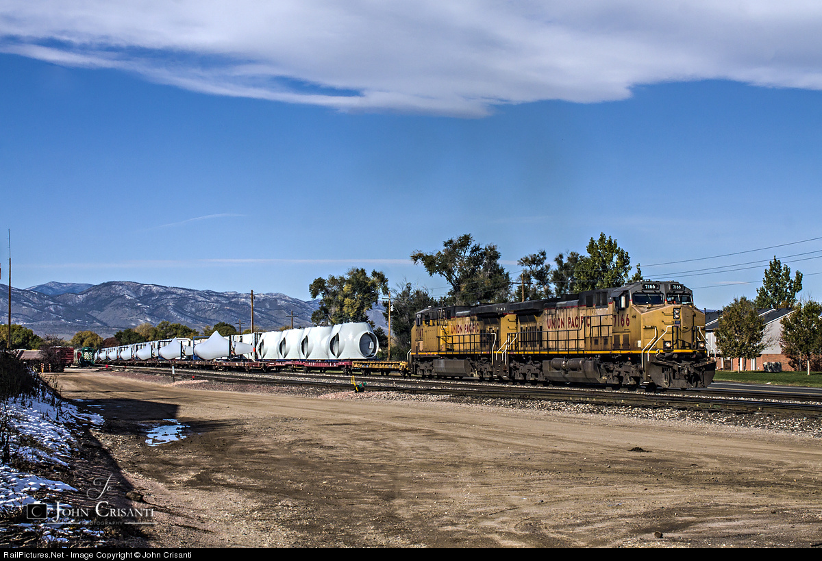 | Two UP AC4400CWs slowly creep up past loaded windmill blade flat cars parked on North Yard Siding in Fort Collins that will be picked up by this train. After the pick up, the train will then go into the siding at Owl Canyon and tie their train down since the crew will be up on their hours of service. |