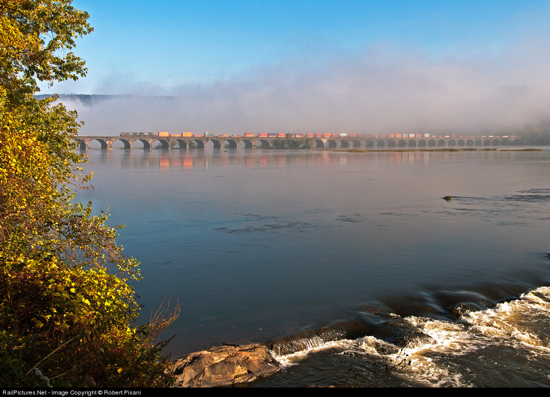 Morning fog still hangs low over the Susquehanna River as a westbound NS intermodal train crosses Rockville Bridge.