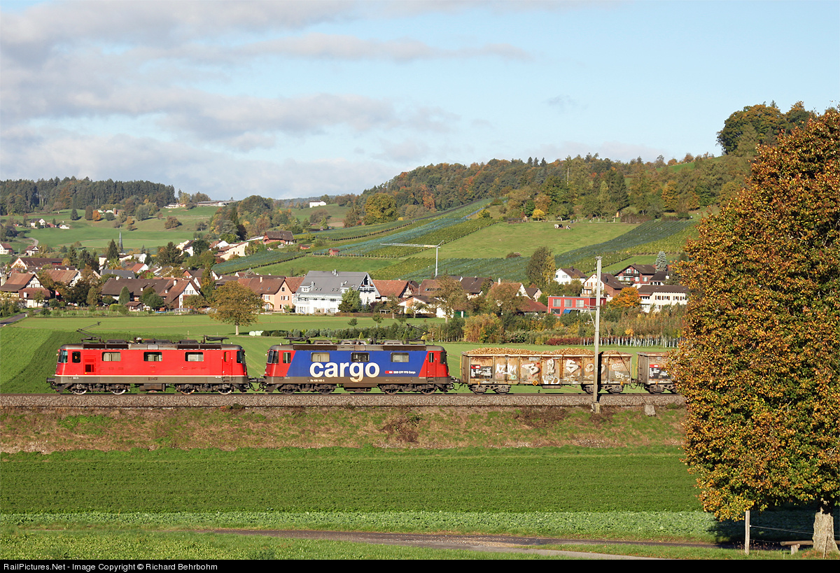 | Re 4/4 II 11261 and Re 420 169 are pulling a train with sugar beets from Schaffhausen to Frauenfeld. |