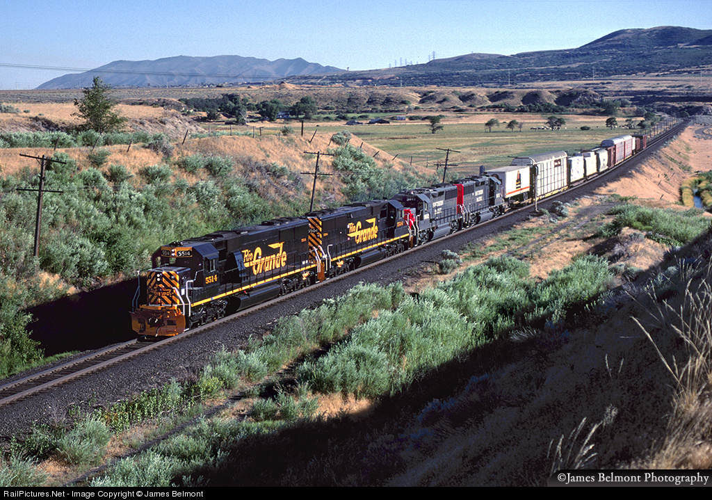 The Denver & Rio Grande Western ran a special for company photographers from Salt Lake City to the Thistle Tunnels on July 21, 1988. The mission was to obtain high quality photos to promote the D&RGW and SP prior to Rio Grande Industries acquisition of the Southern Pacific on August 8, 1988. The classy little train, with six freight cars from each carrier emerges from the Jordan Narrows with two SD50s (DRGW 5514 & 5504) and two GP60s (SP 9602 & 9603) for power. It was run as a work train, symbol DRGW No. 953.