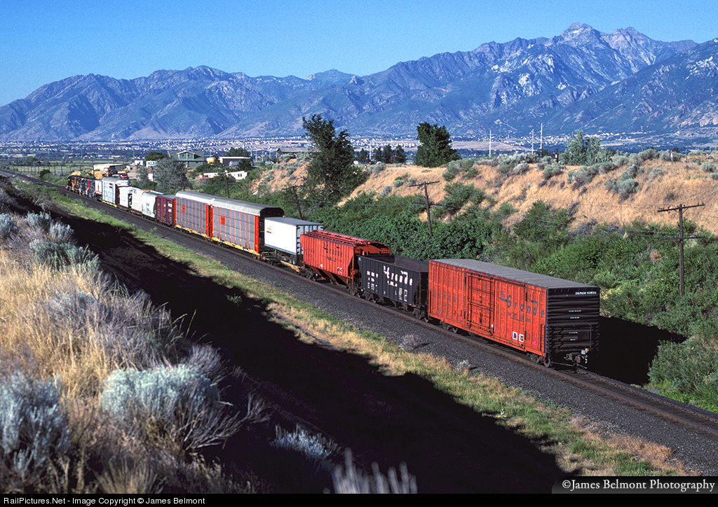 The Denver & Rio Grande Western ran a special for company photographers from Salt Lake City to the Thistle Tunnels on July 21, 1988. The mission was to obtain high quality photos to promote the D&RGW and SP prior to Rio Grande Industries acquisition of the Southern Pacific on August 8, 1988. The classy little train, with six freight cars from each carrier, rambles north through the Salt Lake Valley with two SD50s (DRGW 5514 & 5504) and two GP60s (SP 9602 & 9603) for power. It was run as a work train, symbol DRGW No. 953.