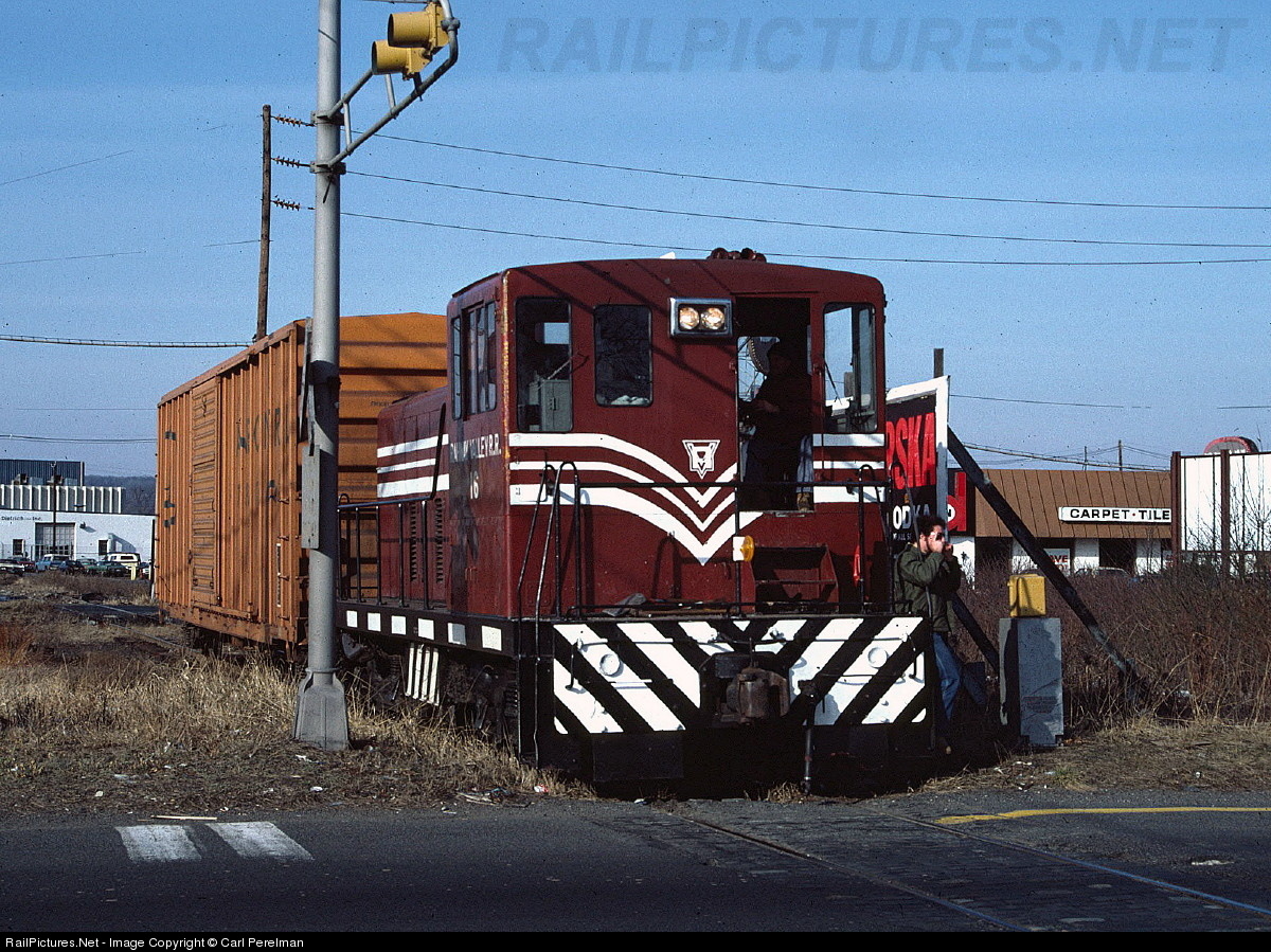 | Rahway Valley 16 is crossing the busy U.S. Route 22 grade crossing in Union with one empty MEC boxcar in tow for the Conrail interchange. This railroad has been abandoned and the grade crossing removed. Rahway Valley 16 has been preserved and is on display at the Whippany Railway Museum. |