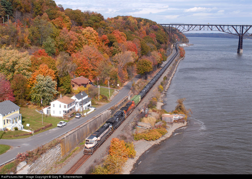 Sometimes it helps to have a little bit of a thick skin to do shots like these. Case in point the grueling waiting game on a windy Saturday late morning while you watch northbound after northbound weave it's way up as the dispatcher tries to pocket all the short timers out of Jersey. Meanwhile you nervously watch the sky for the numberous low clouds which threaten at times to build out of the south and west and ruin your day. But the blue sky seems to be winning. Now the sun angle is starting to move as well as each new hour passes and still no southbound. But you know the game. It's PATIENCE! If you cut and run or get disgusted and quit you know the price. And it be painful if you only got one day free to get this angle, this historic location, this gathering of foliage color and a great lashup to boot. When at last all the elements finally come together and you know your patience is rewarded. Your frustration now magically a distant memory. Maybe why these shots are so tough is why we keep coming back for more.