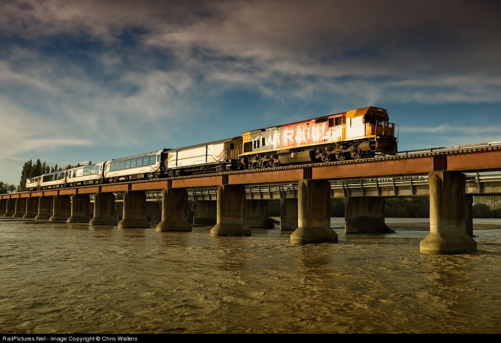 Rebuilt GE DXR8022 races the northbound "Coastal Pacific" across a swollen Waimakariri River en route from Christchurch to Picton.