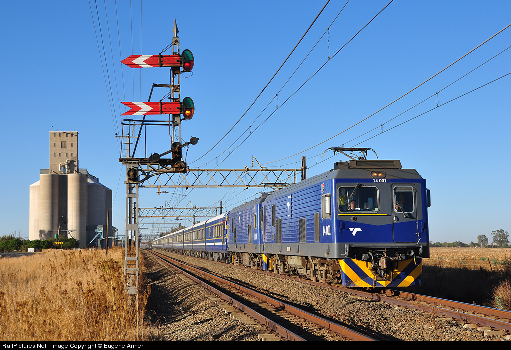 The luxury Blue Train operated a private charter from Pretoria to Bloemfontein for the Macufe Festival (Macufe = Mangaung African Cultural Festival). Northbound on the return journey to Pretoria, the train is just north of Rooiwal station and is passing the outer home and distant semaphore for southbound trains. With replacement of the semaphores due to begin in the next few months, this may well have been the last opportunity to photograph the Blue Train with these classic signals on this route. The train is led by 14E class leader 14-001.