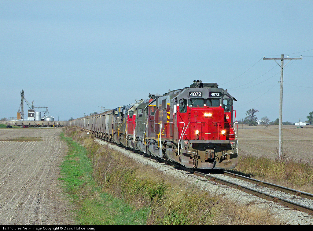 | In a scene that has changed very little in the last 40 years, IORY 4072 leads a southbound Indiana & Ohio Railway grain train through the fields of south-central Ohio on former Detroit, Toledo & Ironton rails. It would be very easy to imagine that this train is a brace of orange DT&I Geeps with an auto parts train in 1973, instead of a mixed bag of I&O and CSX six axles on a grain train in 2013. |