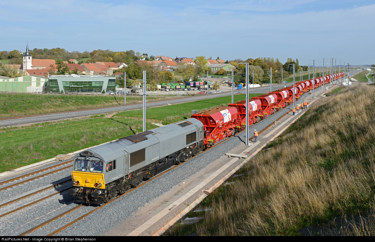 | A new railway that is not on the map! Former DLC class 66 No DE 6304 on hire to French contractor ETF with an empty ballast train on the LGV Est phase 2 line that is under construction in Eastern France. The train is returning to the construction base at Réding via the spur line in the foreground. The village of Hérange is in the background. |
