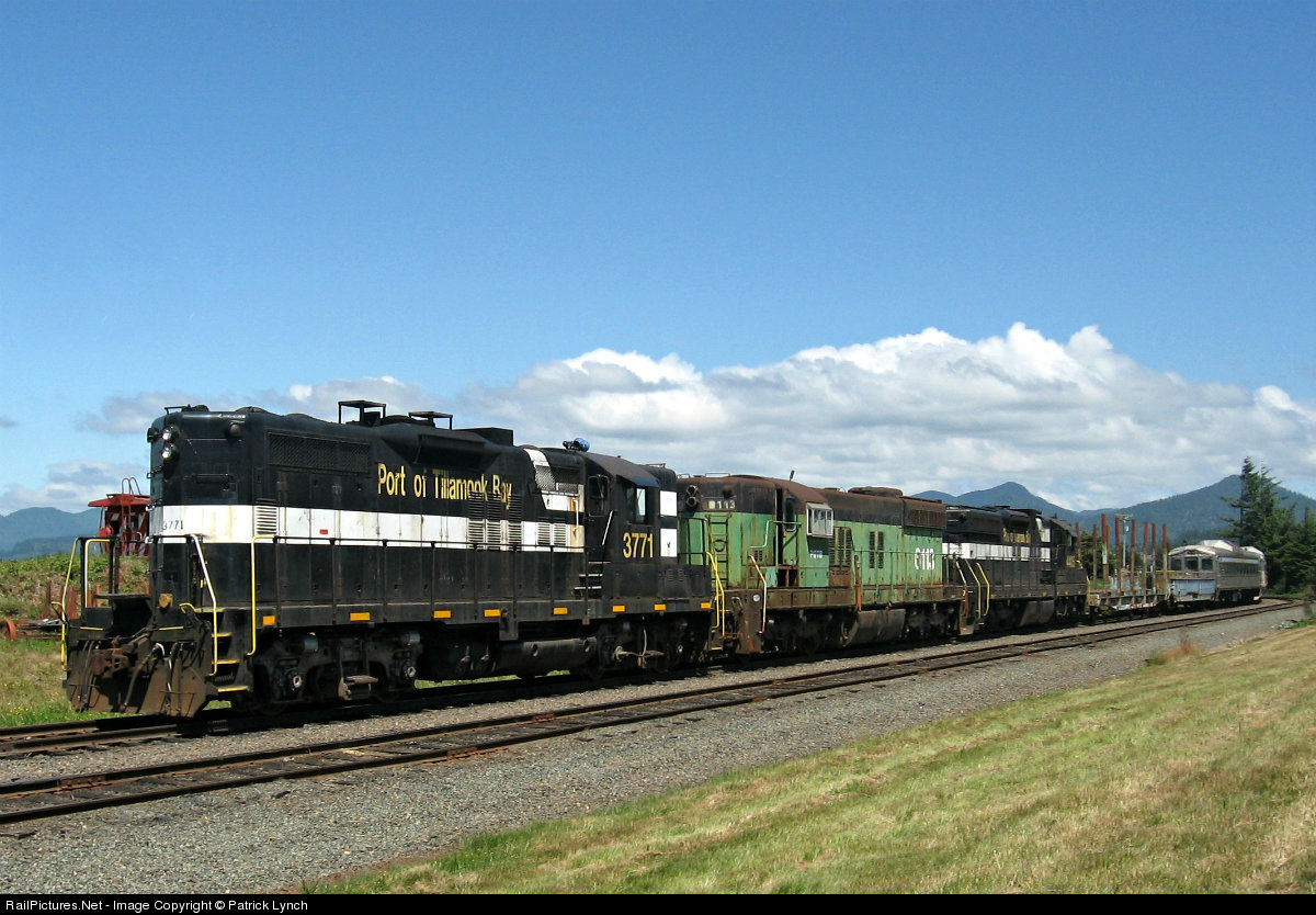 At the Tillamook Air Museum in the namesake town in Oregon, the Port of Tillamook Bay Railroad has a handful of sidings that more often than not has power and rolling stock. Today, POTB GP9 3771, SD9s 6113 and 4405, and some rolling stock including an RDC car are all parked on the main siding outside the air museum.